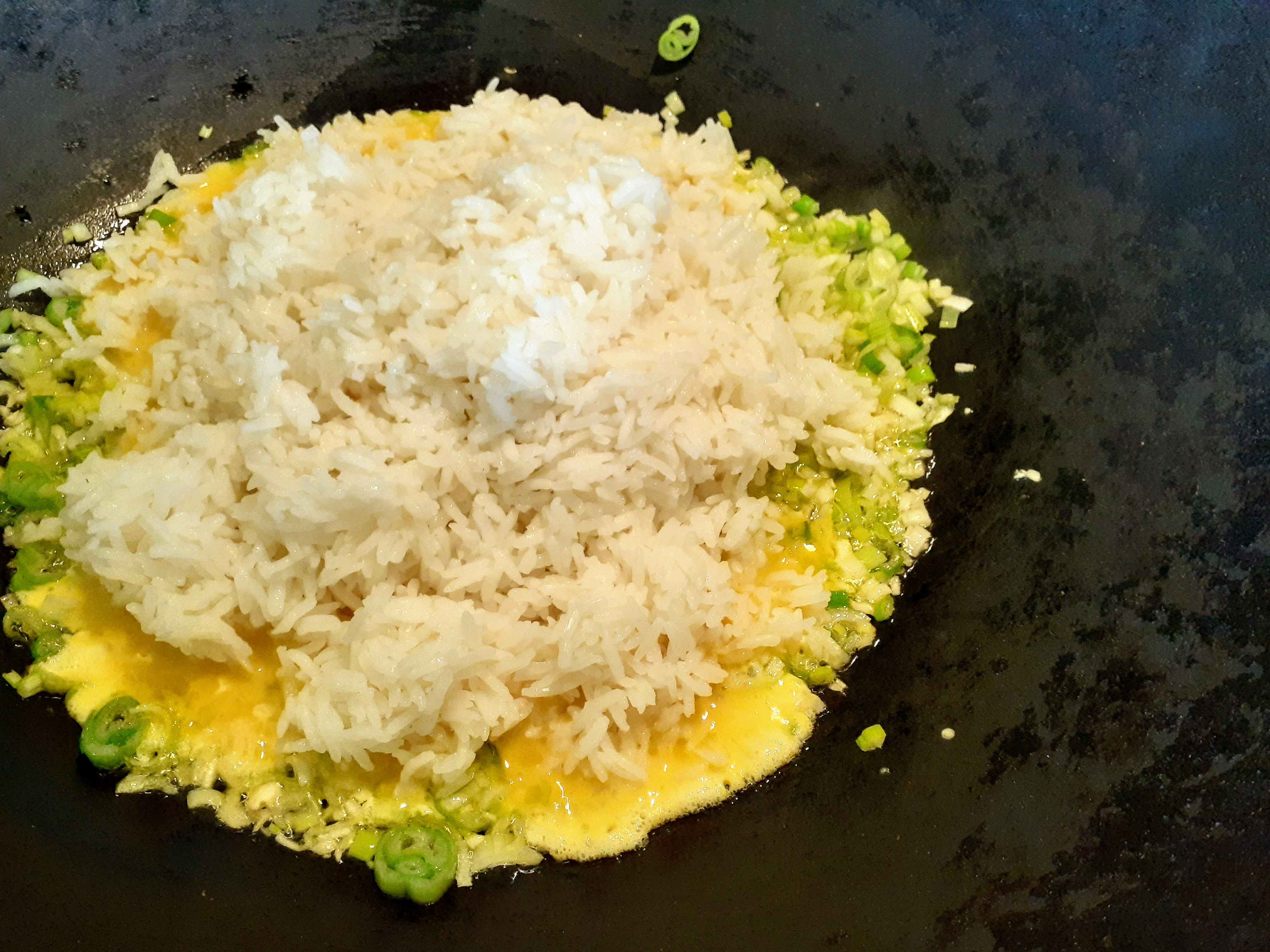 - Cook rice with slightly less water than normal, so that the rice won’t be too sticky after absorbing the egg in the wok.