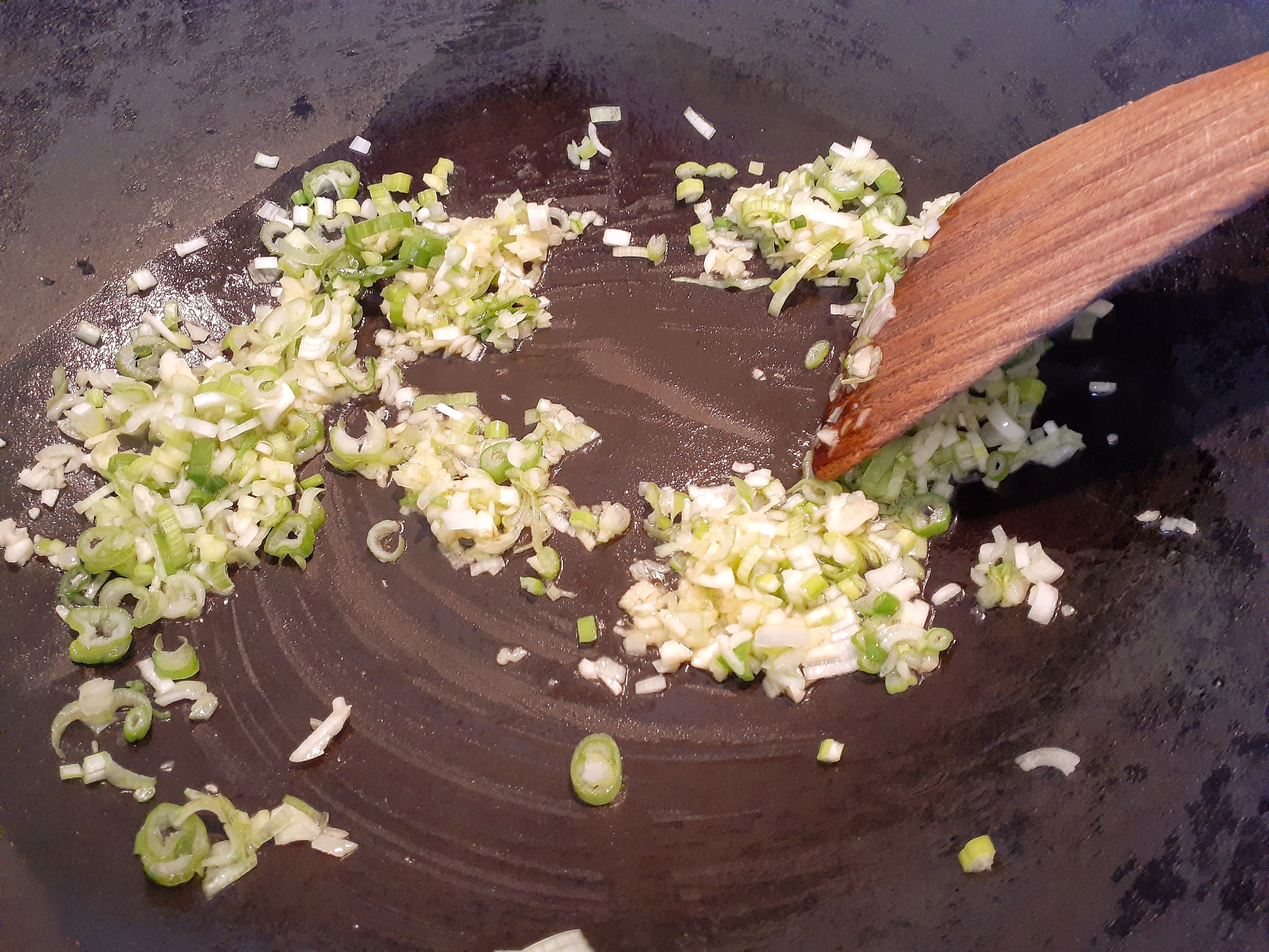 5. Add the protein (either meat or prawns or both), the green part of spring onion and stir all of them.