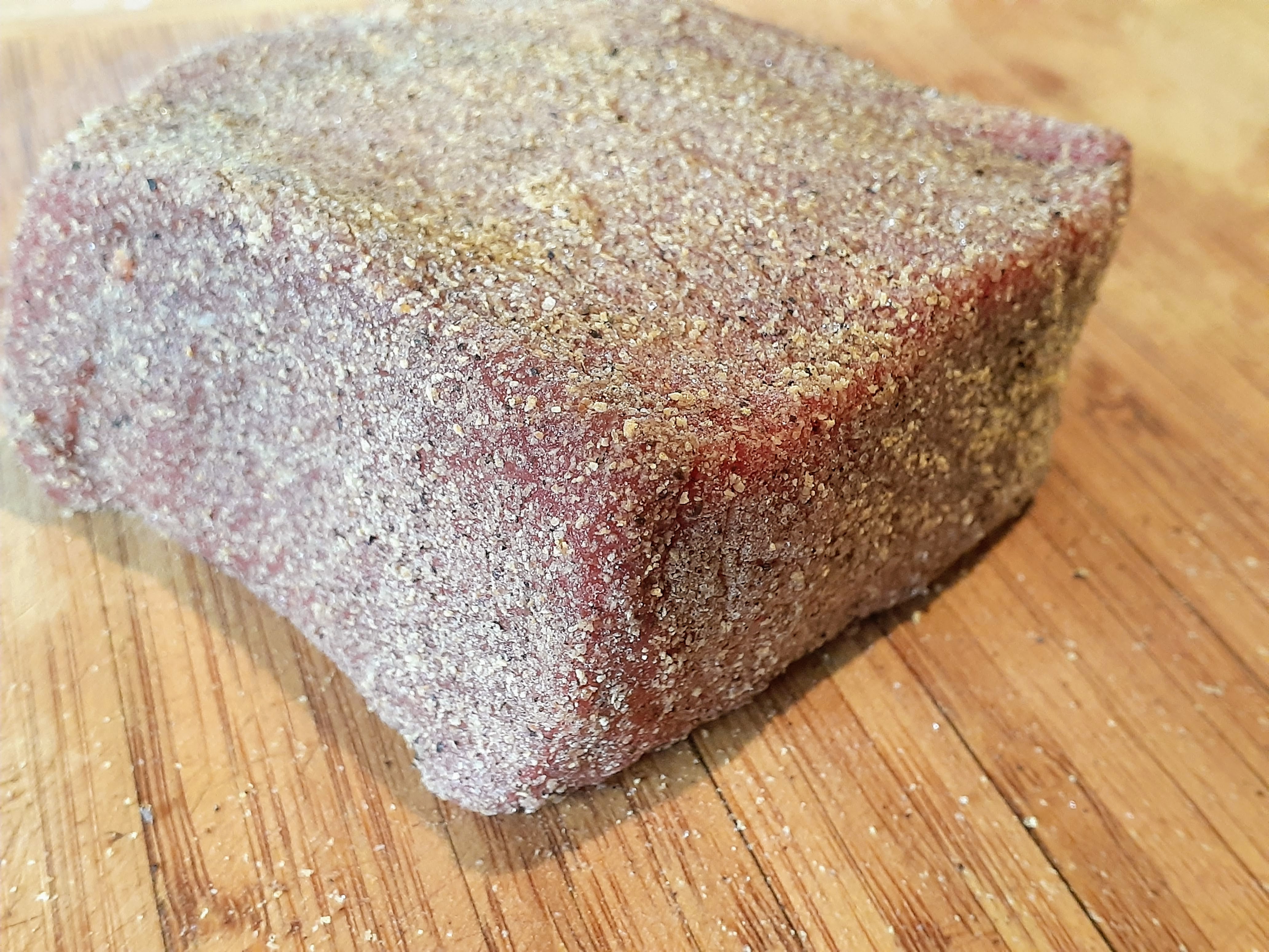 2. Apply salt, black pepper and garlic powder all around the beef and rub them into the beef