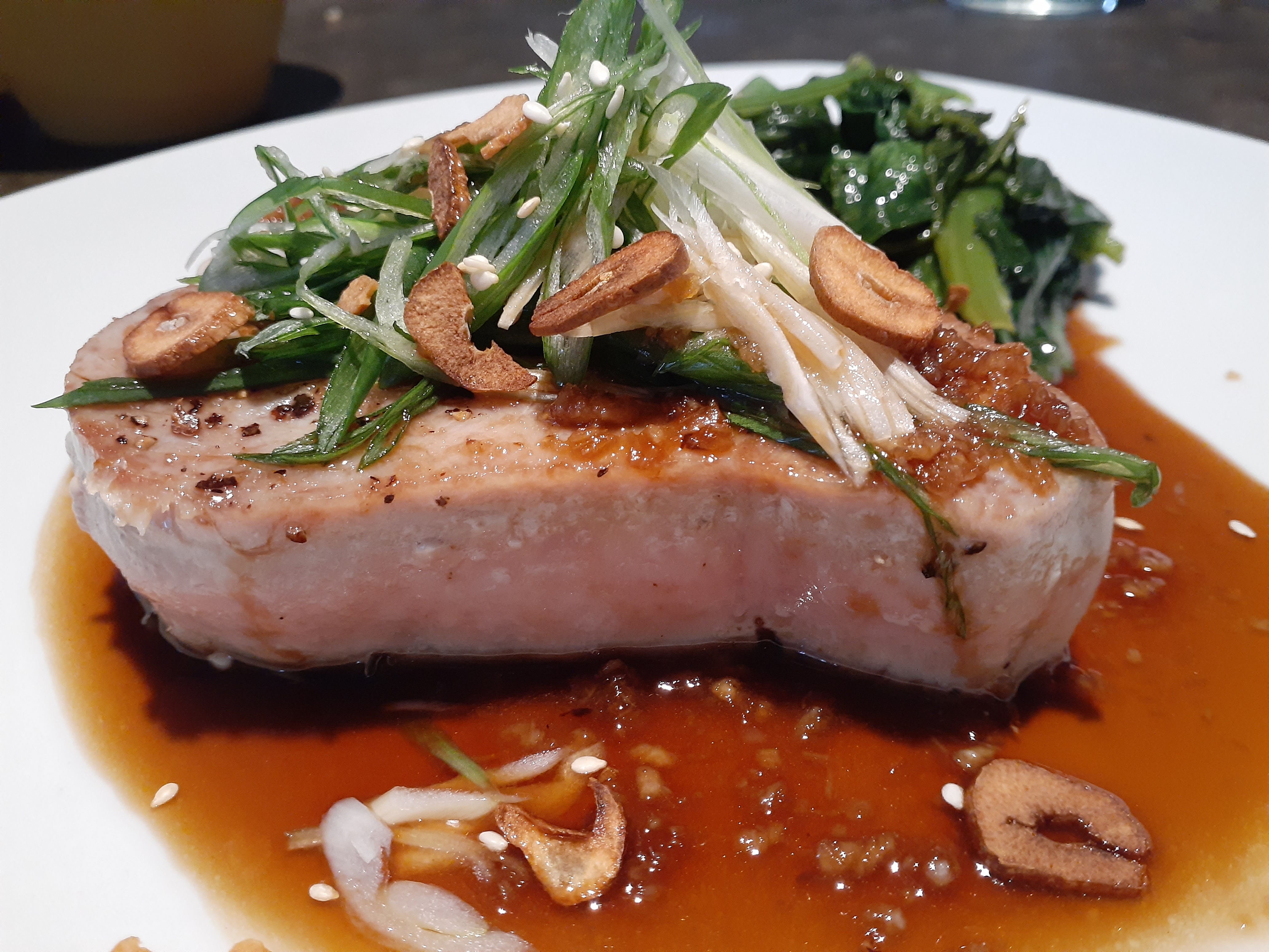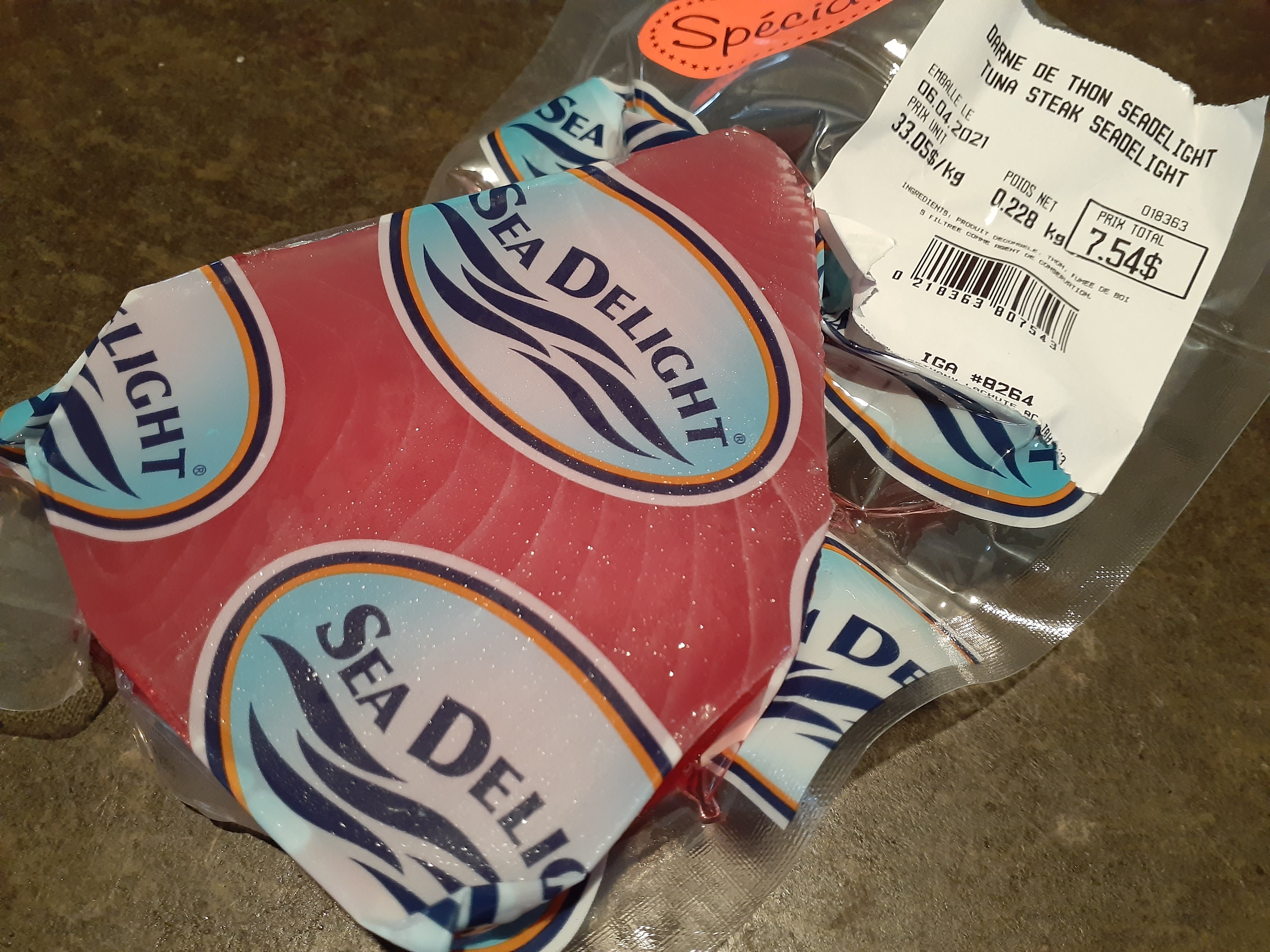 Frozen Tuna for Sashimi is not only delicious when you make Sashimi or Tartar, but it’s also good for a luxurious steak simply pan-fried. Since it is designed for Sashimi, you don’t have to worry whether it’s cooked properly or not. You can just cook it as you like from slightly searing to well-cooked. I prefer cooking it medium with the pink colour inside. Today, I added maple syrup and white wine sauce with it.