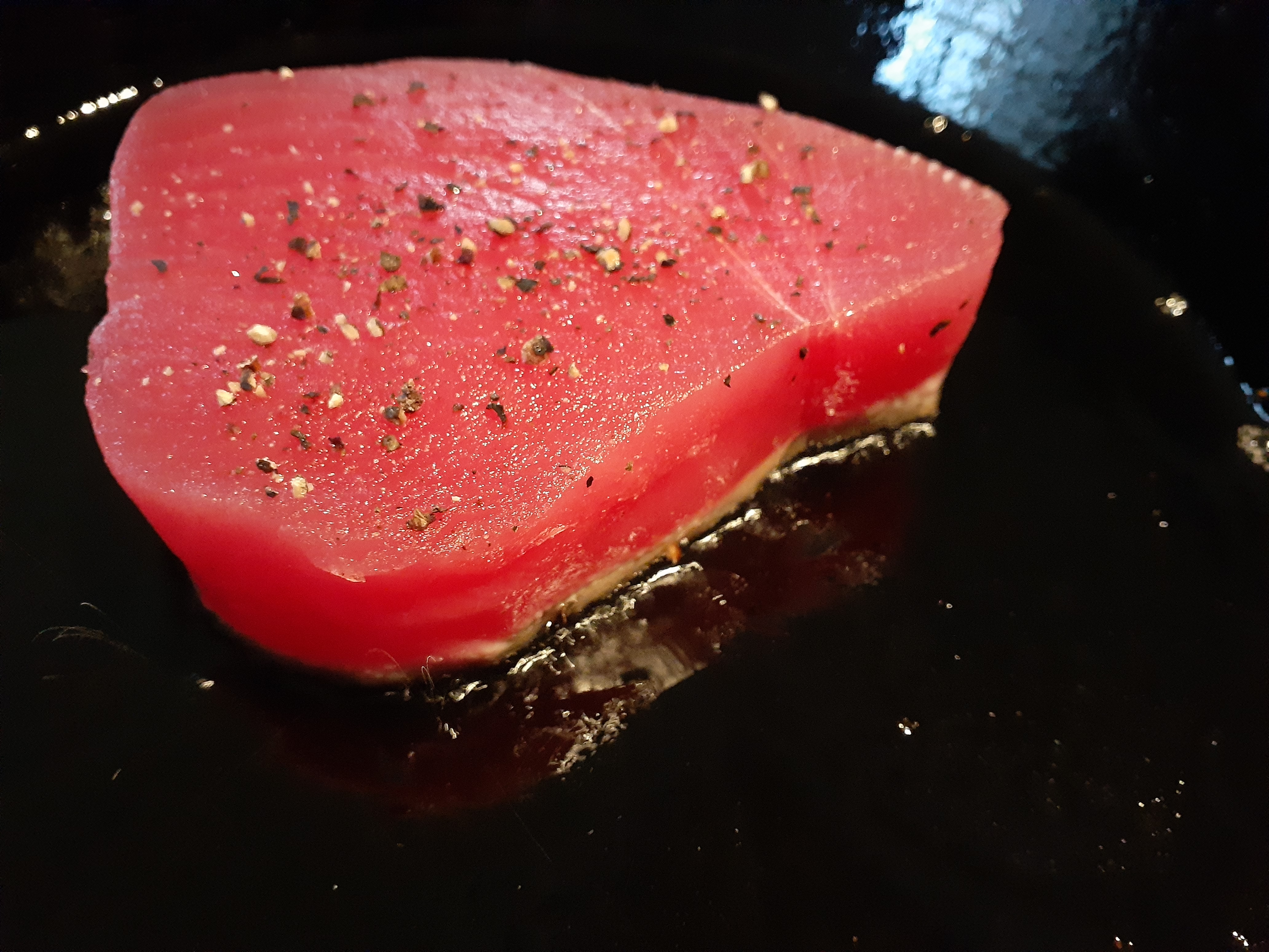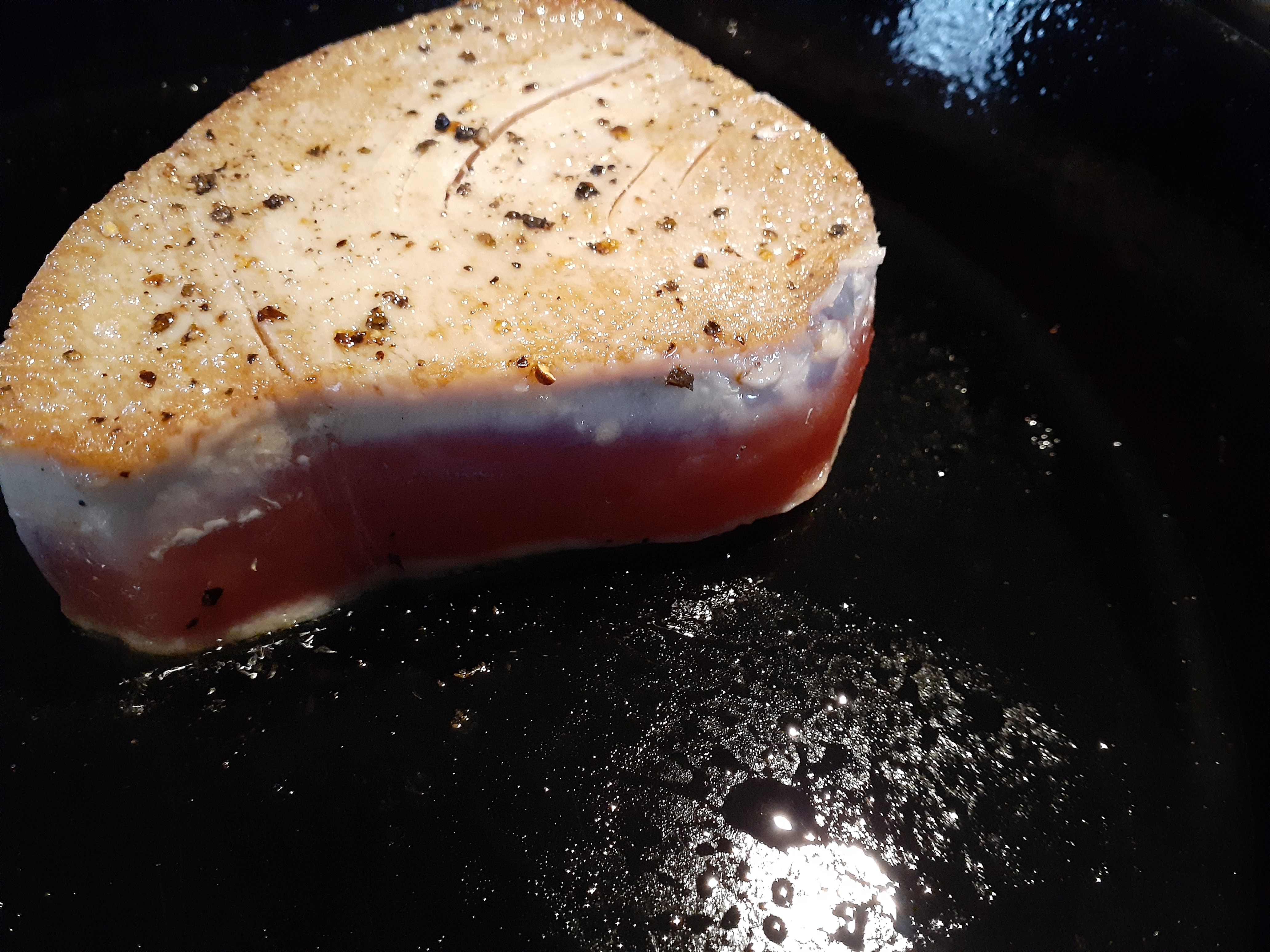 2. Place the tuna in the frying pan, put the lid on, cook both sides on a low-medium heat until they are cooked as well as you like.