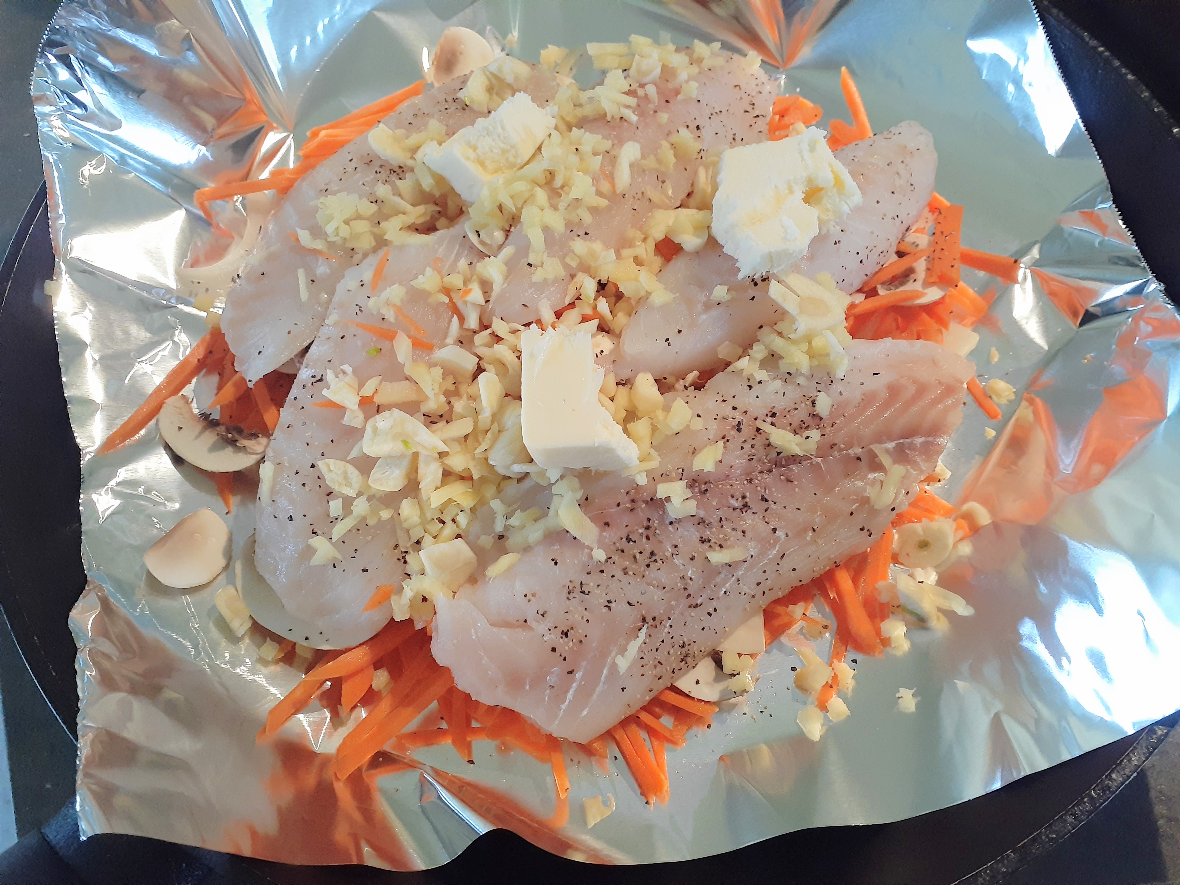 - Put the fish fillets with salt and black pepper on them, and then put chopped garlic, white wine, and butter on the top. (If you make individual wraps, wrap up the fish and vegetables with foil and close on the top.)