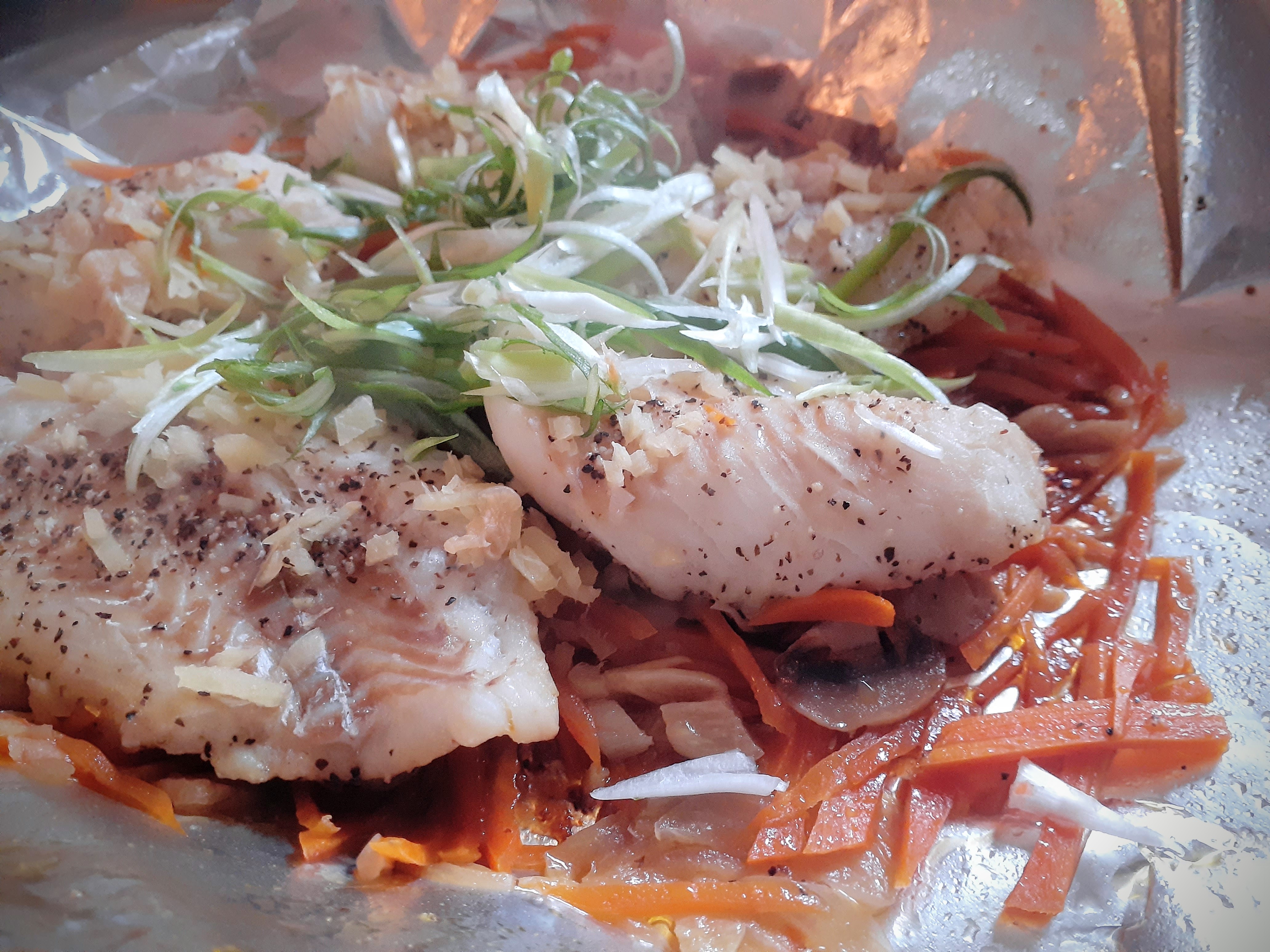 When I cook this dish for my boyfriend and me, I put all of the ingredients in a frying pan with aluminium foil, but it’s normally steamed in a individually wrapped up foil for each person in Japan. After they are cooked, we serve the fish wrapped in the foil without opening to each person, so that the aroma and flavour will softly spread as soon as you open the foil just before eating.