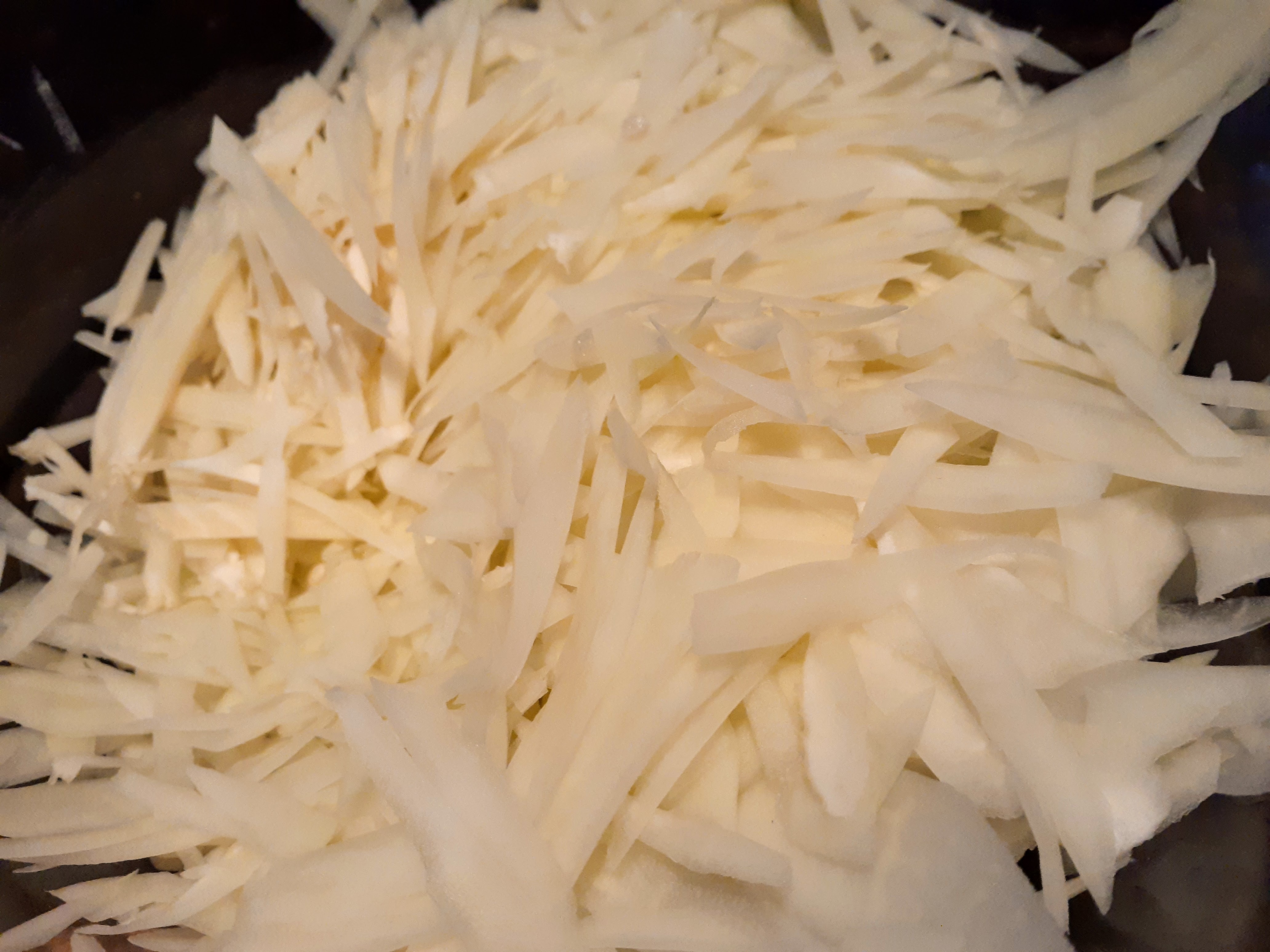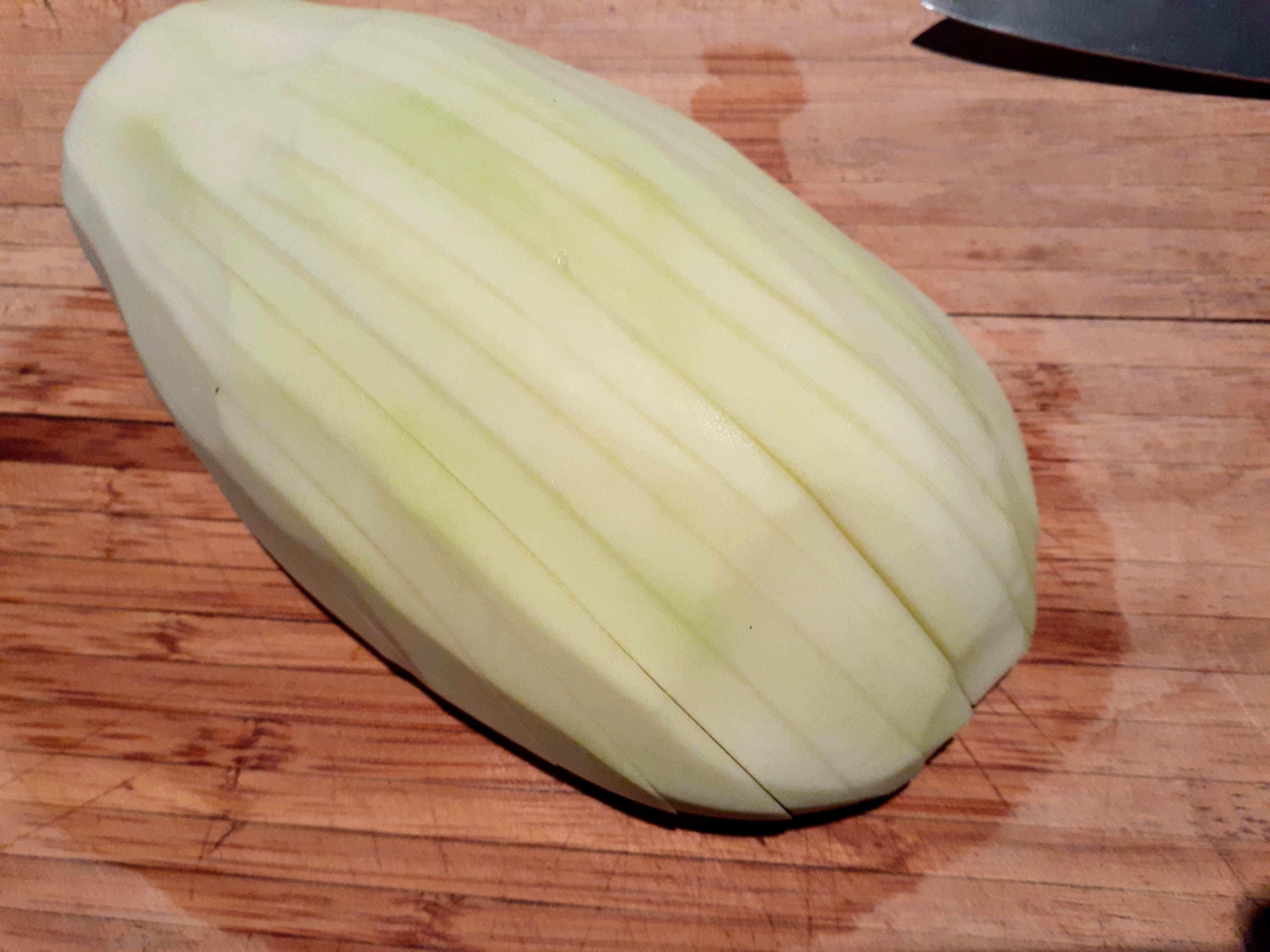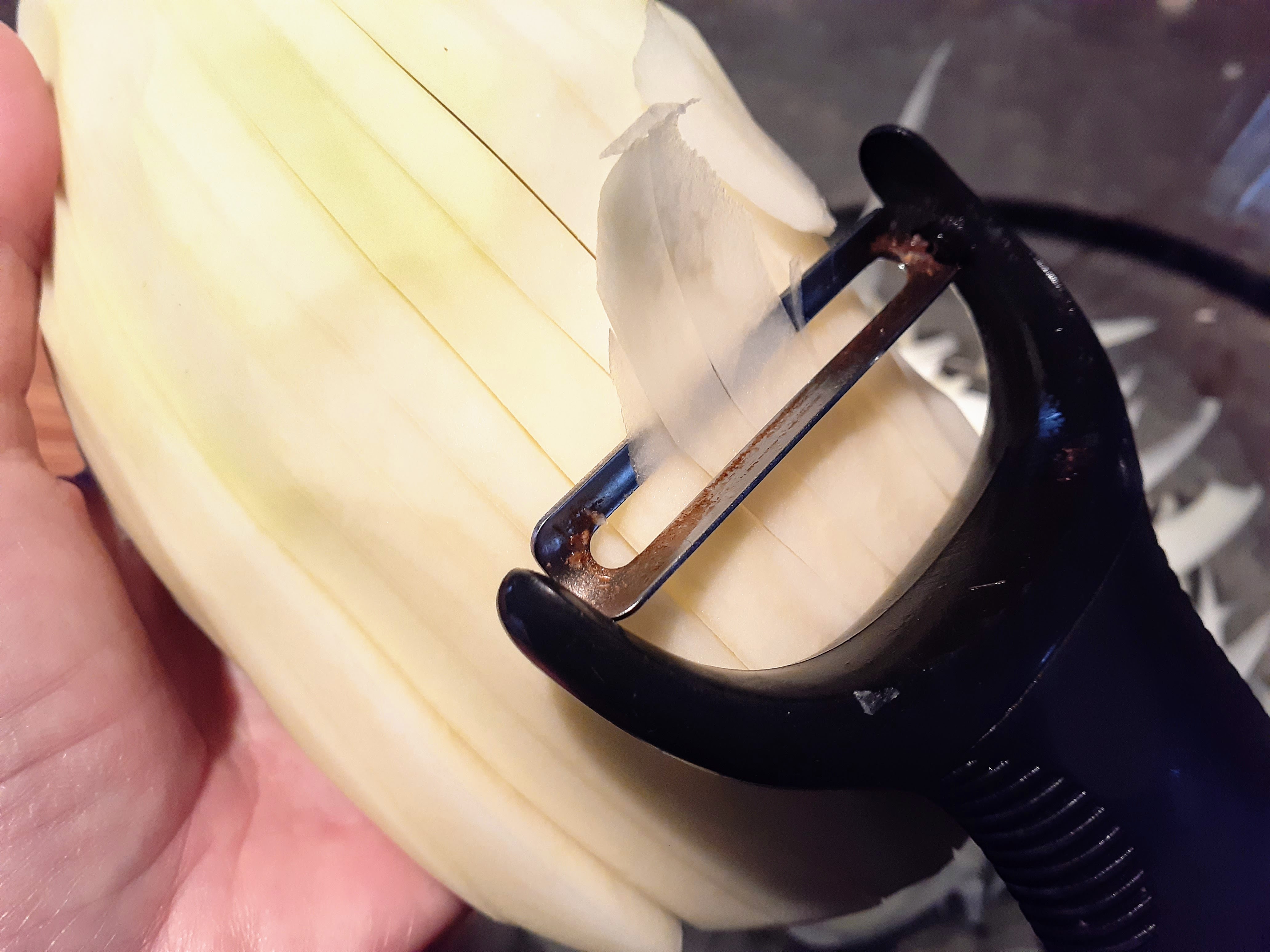 2. Cut deep notches with 5-7 mm gaps between each other and shred it with a peeler (you can also thinly slice it and cut into small pieces with a knife).