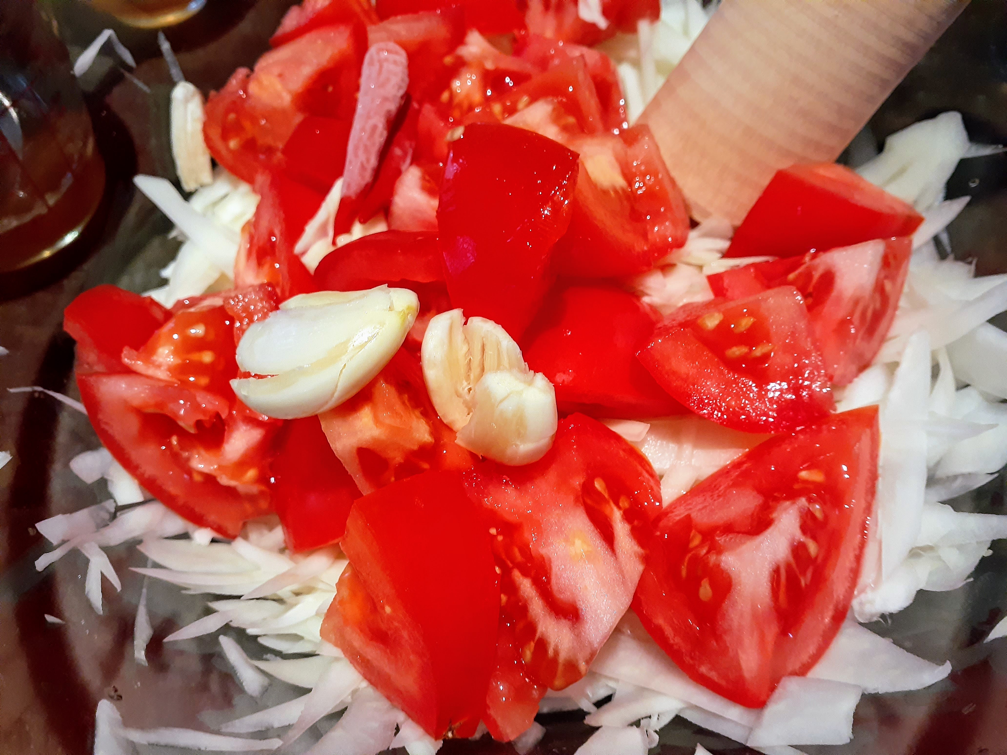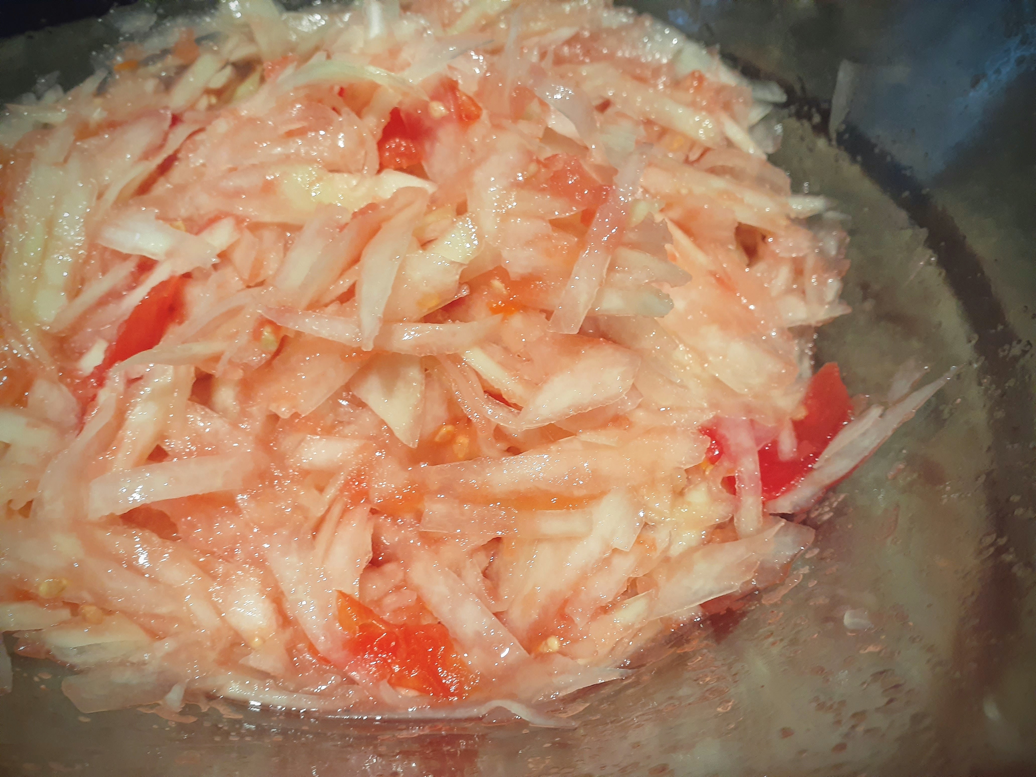 3. Put the shredded papaya in a bowl, add cut tomatoes, crushed garlic, red chillies and bang them with a pestle until the green papaya gets soft and a little transparent in colour.
