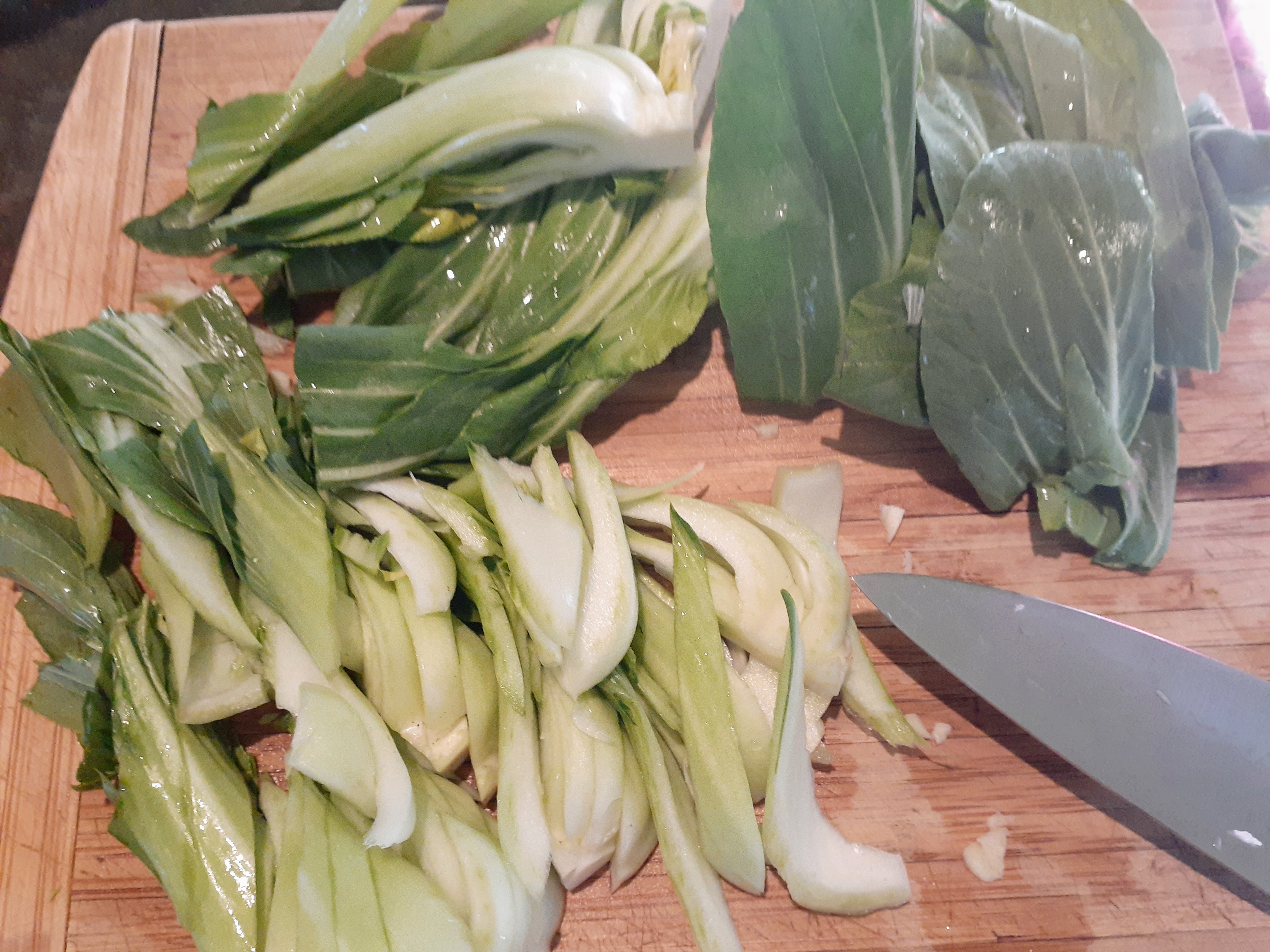 - Clean the Shanghai Choy, cut into small pieces, separating the green parts and whitey parts