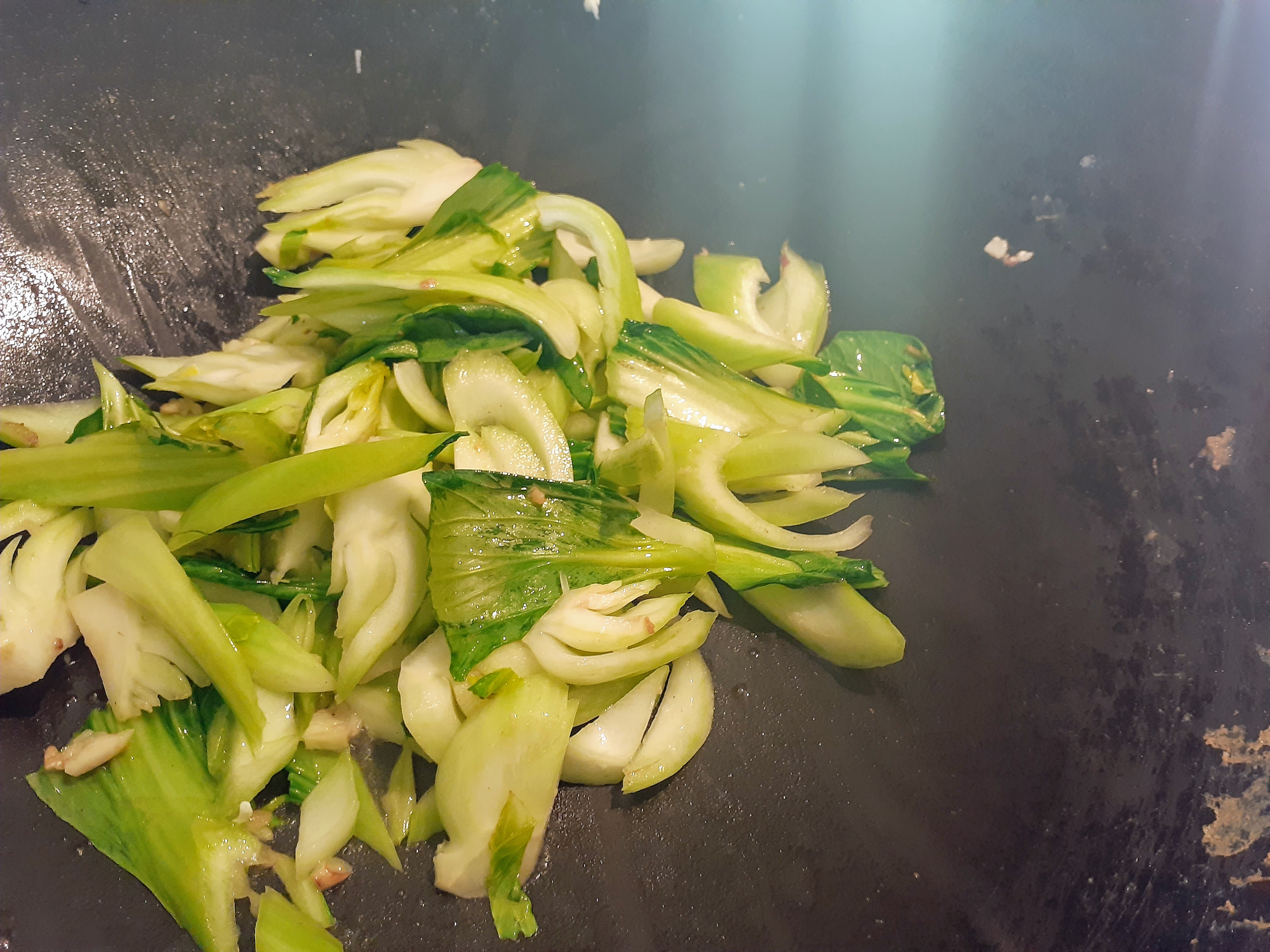 2. Heat another tablespoon of vegetable oil again, add the garlic and white parts of Shanghai Choy and cook, stirring occasionally