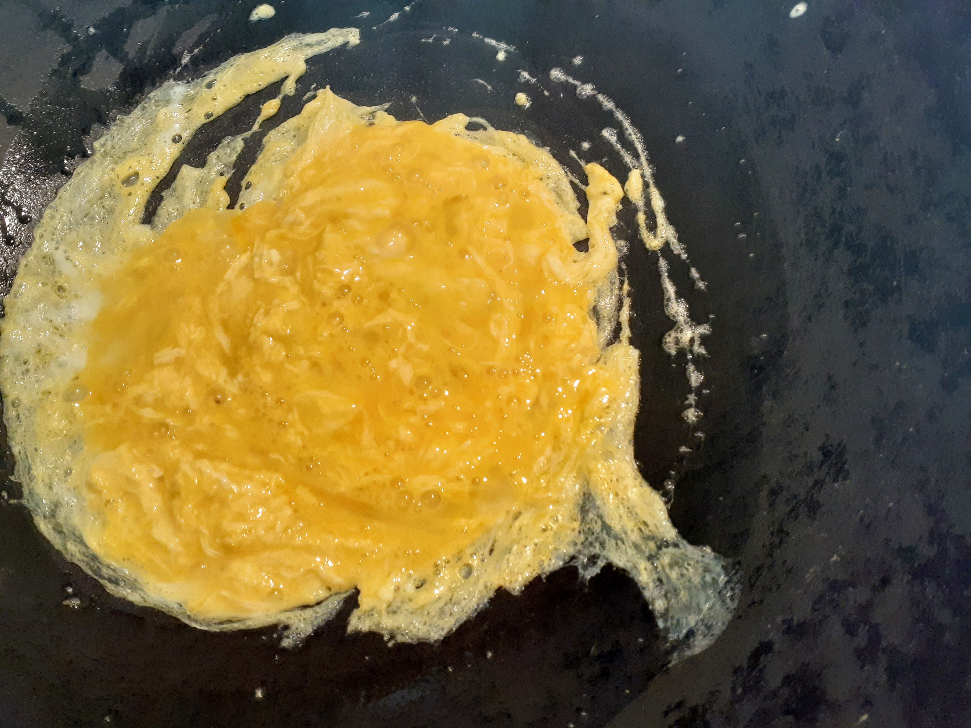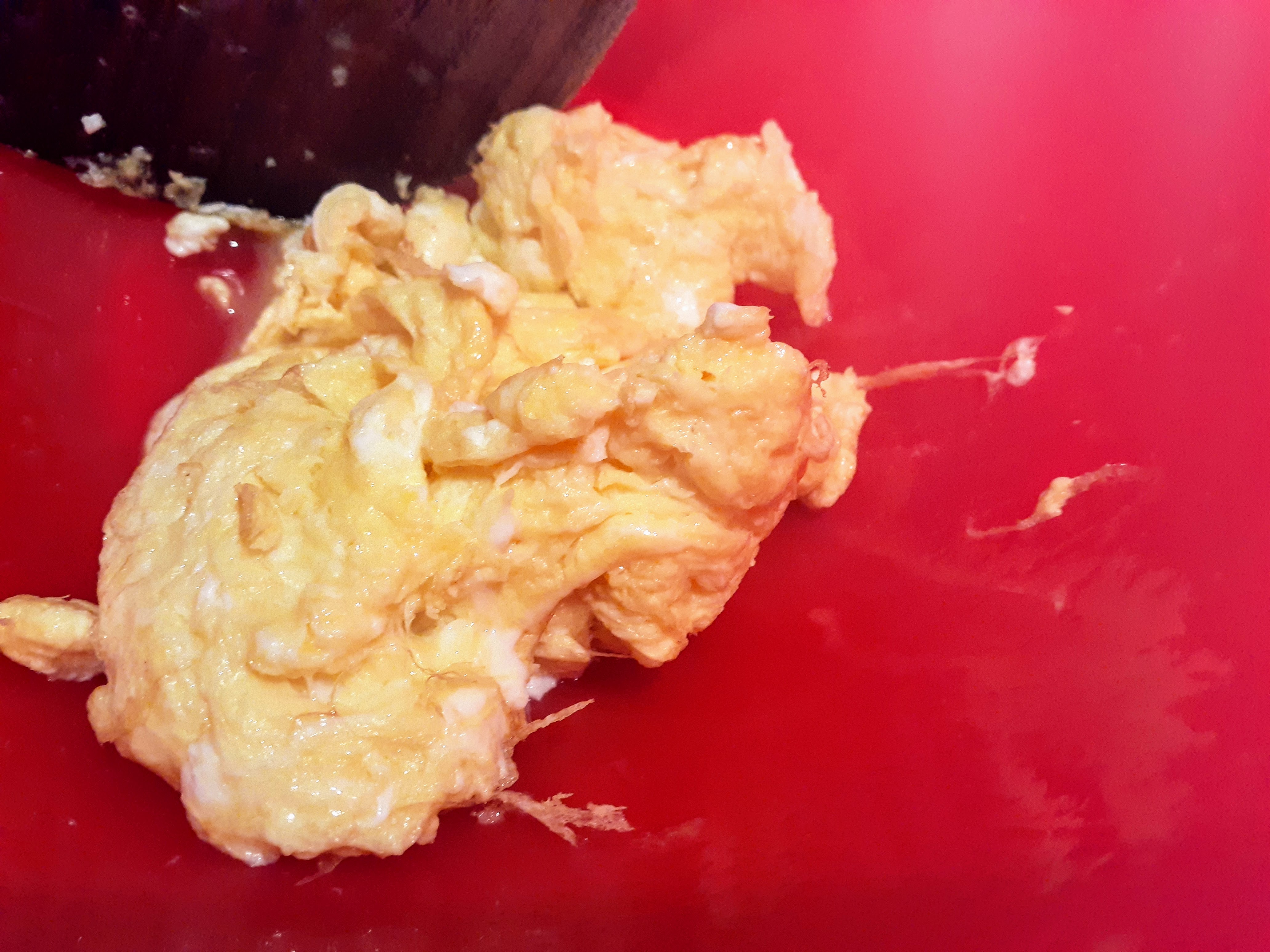The eggs need to be stir-fried separately, because they could be hard when they are cooked too much.
