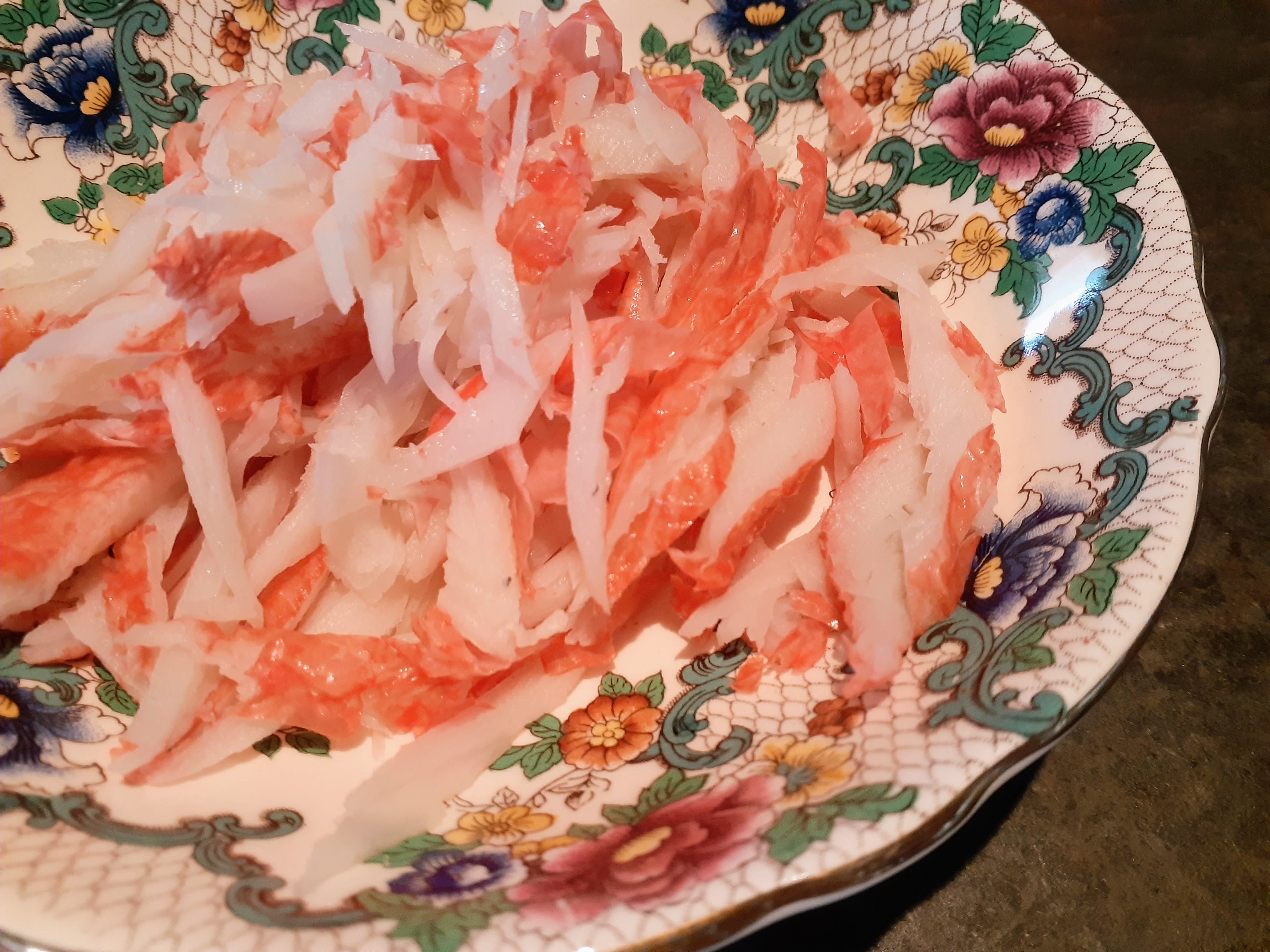 3. Thinly slice the crab sticks or split them by hand.